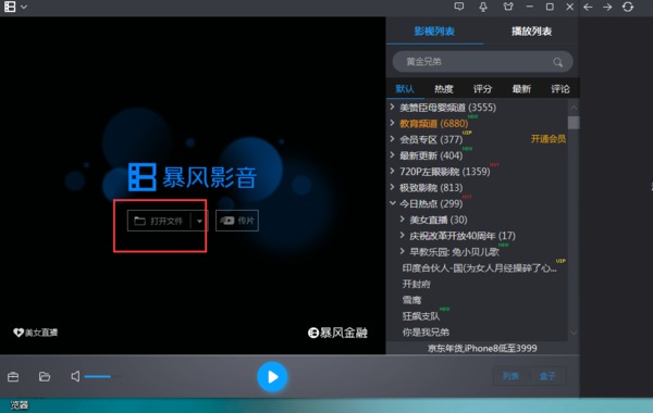 4、此时打开“暴风影音”软件,点击“打开文件”选项