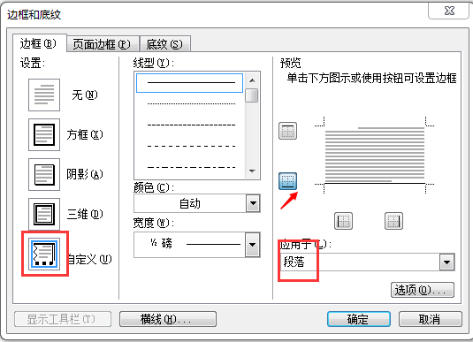 3、在边框设置对话框,选择“自定义”,应用于“段落”,选择线型,在预览处单击下边框按钮设置下边框(如果想使线在文字之上也可以选择上边框)