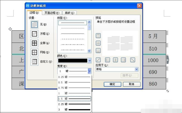 (3)再选中表格,打开菜单“格式-边框和底纹”,在线型宽度下拉列表中选择一条粗一点的线,如1又1/2磅,在右边的各种实框线中,为表格添加“上”、“下”框线。确定。