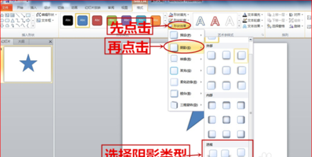 在格式下,先点击“形状效果”再点击“阴影”,在透视中选择要的阴影类型。