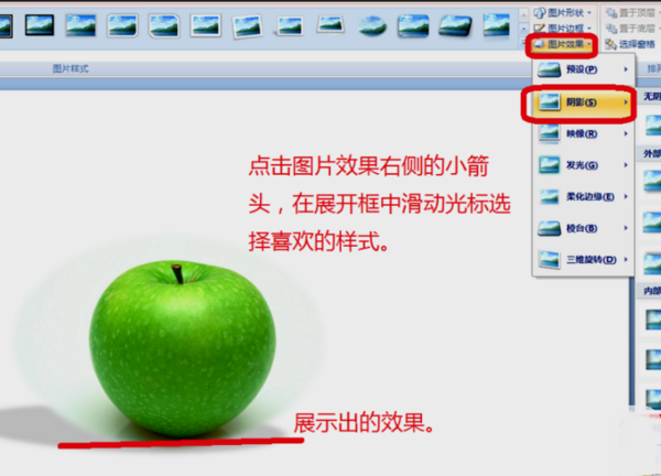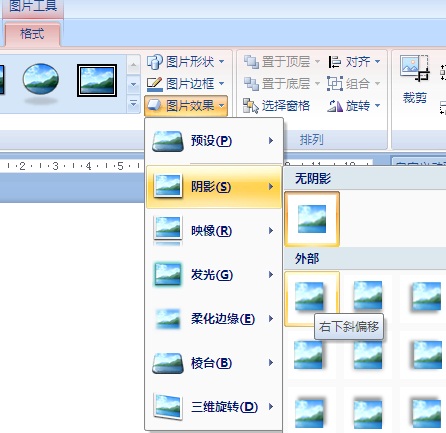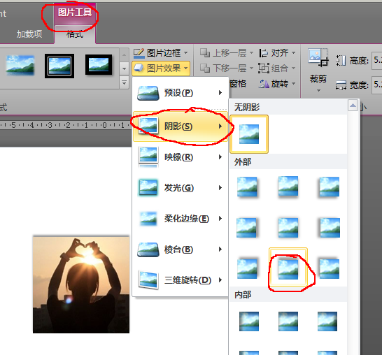 3.在图片效果中有阴影、倒影、发光等各种图片效果,选择阴影这个效果。