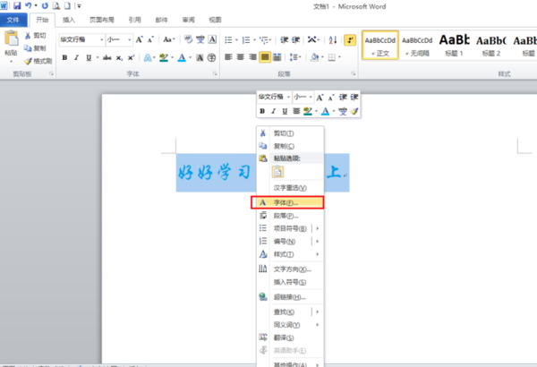 3、点击鼠标右键,在弹出的许多选项中选择“字体”。