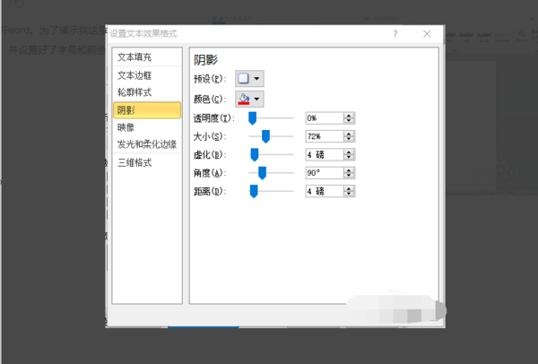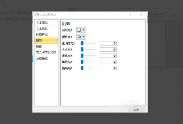 5、在设置文本效果格式中选择“阴影”,在里面对阴影的颜色和大小等进行调整后点击关闭。