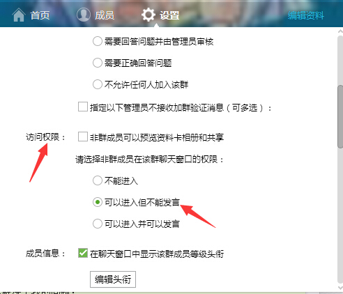 2、在访问权限中,找到“请选择非群成员在该群聊天窗口的权限”勾选“可以进入但不能发言”即可。