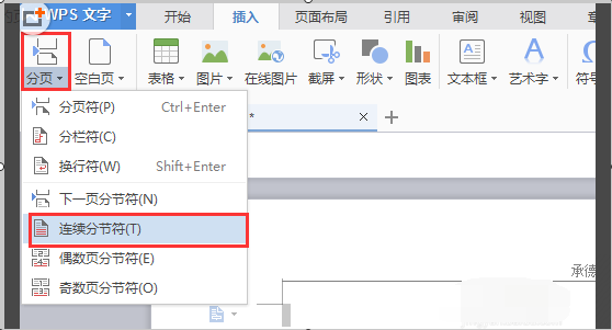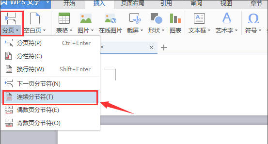1、选择菜单栏中的插入,选择分页的图标在下拉菜单中选择连续分节符选项。