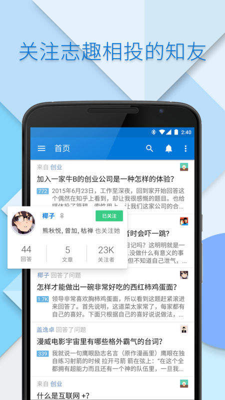 【发现】每天有和你志趣相投的知识青年在知乎的发现页面遇见精彩内容、有趣的回答,当你关注他们,他们的提问、回答、赞同和关注,你都能看得见;