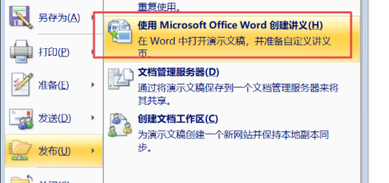 2、然后我们在弹出来的窗口中点击选择发布中的“使用Microsoft Office Word创建讲义”。