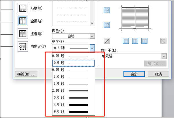 2、在“宽度”中选择一个所需合适的粗线,点击确定按钮即可。