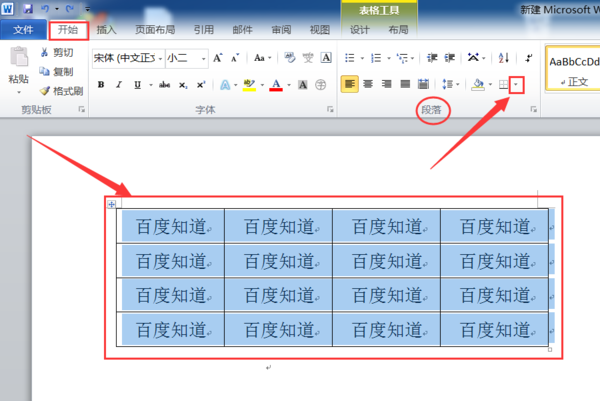 1、打开需要设置的word文档,鼠标选中需要设置粗边框的表格,在“开始”选项卡找到“段落”,点击“边框”旁边的下拉按钮。