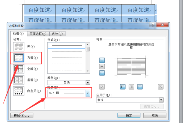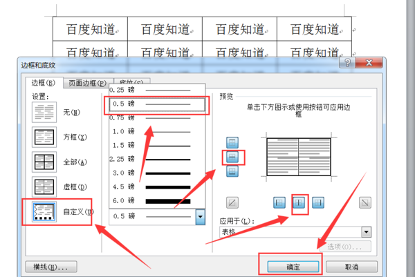 5、再把表格内部细线框不齐,点击左边的“自定义”,线宽选择“0.5磅”,点击右侧小方框内部的横、竖按钮,绘制表格内部线框,然后点击“确定”按钮即可。