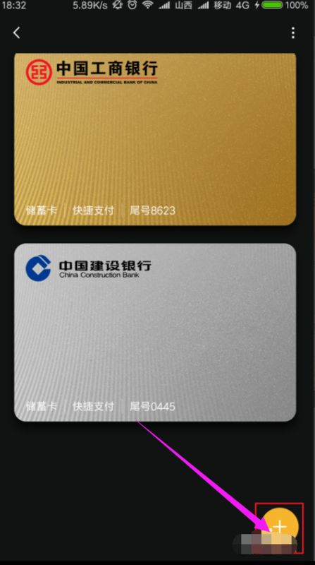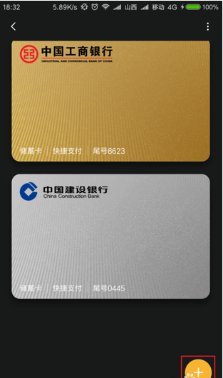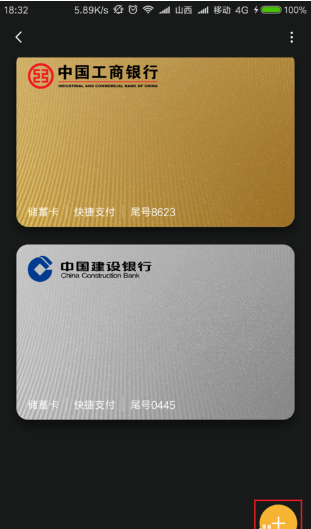 2.打开小米钱包应用之后,点击页面中的“银行卡”字样,并点击页面中的右下角的“+”按钮,点击之后即可绑定新增一张银行卡。