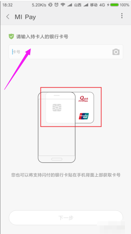 5、输入银行卡的卡号,或者将银行卡放在手机后面自动获取卡号。