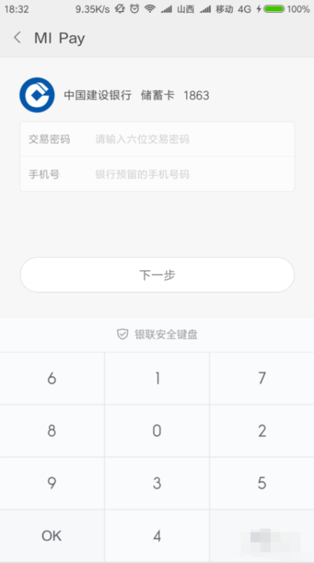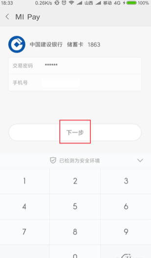 6、输入银行卡的交易密码和手机号,并点击下一步。