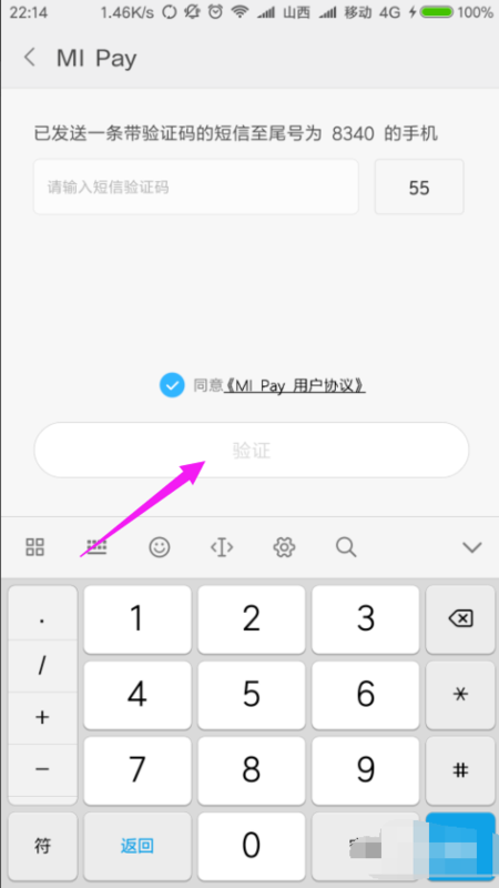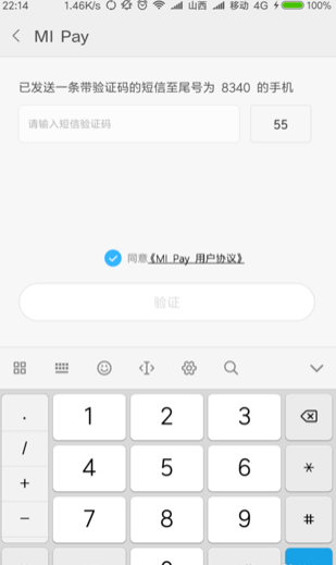 7、输入手机验证码,并点击验证即可添加银行卡、打开mipay。需要使用mipay的时候将手机放置在感应器上即可。