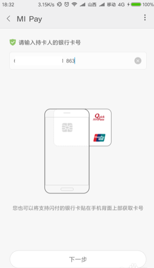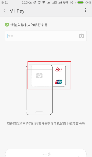 4.这里,由于我们的银行卡支持闪付功能,同时也内置了NFC模块,可以将银行卡贴于手机背面,即可自动读取银行卡号。当然,你也可以手动输入银行卡号。