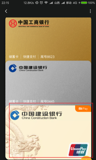 8.最后,我们返回到小米钱包的绑卡页面,在该页面中即可看到我们已经成功添加了支持闪付功能的银行卡,也开通了MI Pay功能。
