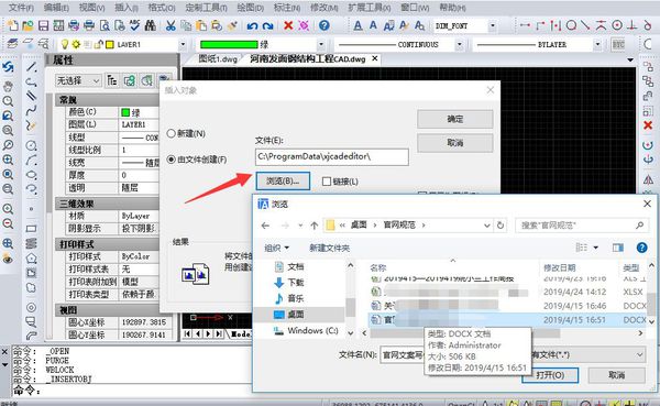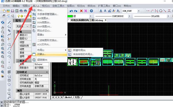 首先在你的CAD编辑器上打开一张图纸文件,突然在上方的栏目框中点击选择插入——对象