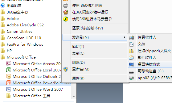 3、点开始按钮——所有程序——Microsoft Office——选中Microsoft Office PowerPoint,鼠标右键选择【发送到】——桌面快捷方式。