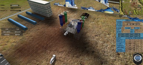 值得一提的是三维虚拟仿真技术在物联网的应用,给商用混凝土搅拌站的物联网应用开创了新的时代。系统实现搅拌站与车辆实时运行状态模拟功能。以动画形式呈现搅拌站实时动态信息,其中可包括:工程名称、施工配比、搅拌站配料情况及其他原材料配料情况,搅拌站场景如下图所示。