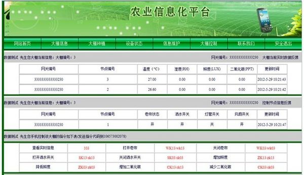农业物联网的应用比较广泛的是对农作物的使用环境进行检测和调整。例如:大棚(温室)自动控制系统实现了对影响农作物生长的环境传感数据实时监测,同时根据环境参数门限值设置实现自动化控制现场电气设备,如:风扇、加湿器、除湿器、空调、照明设备、灌溉设备等,亦支持远程控制。常用环境监测传感器包括:空气温度,空气湿度,环境光照,土壤湿度,土壤温度,土壤水分含量等传感器。亦可支持无缝扩展无线传感器节点,如:大气压力、加速度、水位监测、CO、CO2、可燃气体、烟雾、红外人体感应等传感器。