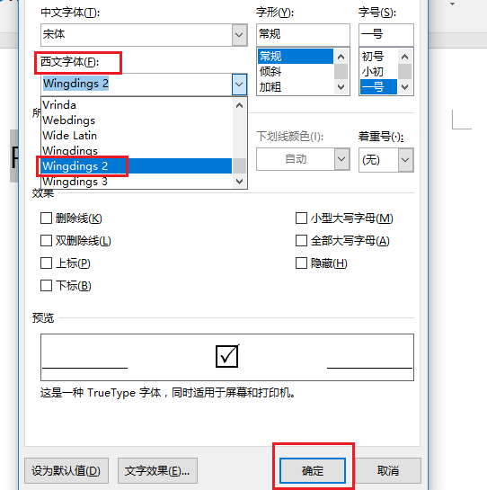 5、在西文字体栏目中,将字体改为【Windings2】,点击下方确定按钮