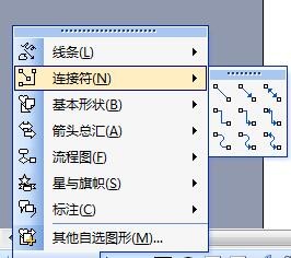 接下来,我们要建立各种图形之间的连接了。这里我们使用Word提供的一个非常好用的自选图形——连接符来建立连接。 连接符的选择见下图;