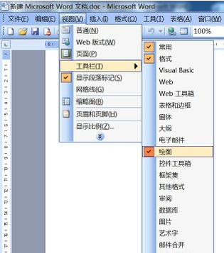 1、打开word2003,点击“视图”-“工具栏”-“绘图”。