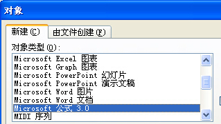 2、在弹出的对象对话框中选择 Microsoft 公式3.0 ,然后确定。