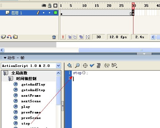 怎么样在flash最后一帧添加stop命令,请告诉我详细步骤,谢谢!