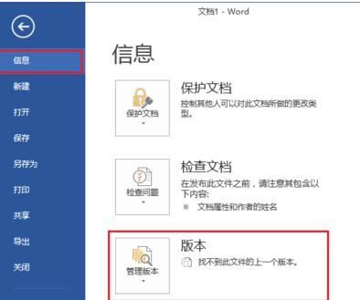 3.进入信息面板后,选择“版本”里的“恢复未保存的文档”。