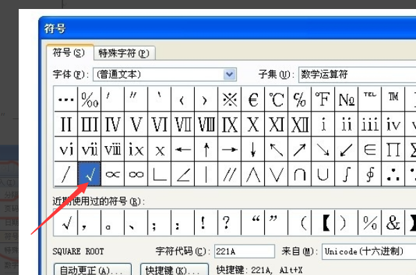 点菜单里的“插入”--》选择“特殊符号”--》出现“插入特殊符号”对话框--》选择“数字符号”,在这里就有这个对号了,你可以双击它,就可以插入了。