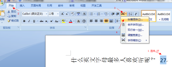 07版WORD有个功能,选中27,然后找到"中文版式"点击选择"纵横混排"