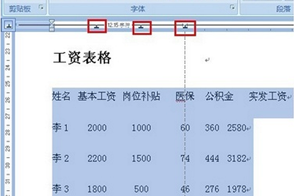 3、选中要按小数点对齐数字的表格列,然后单击水平标尺上的适当位置,则小数点对齐方式制表符出现在水平标尺上,而且表格中的数字即会在该处对齐小数点。如果单击的位置不太合适,可以拖动水平标尺的小数点对齐方式制表符进行调整。
