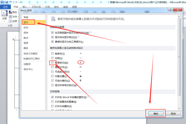 进入到显示栏目界面中,在中间,我们可以发现一个选项“段落标记”,去掉其前面的“√”,然后点击下方的“确定”关闭设置。