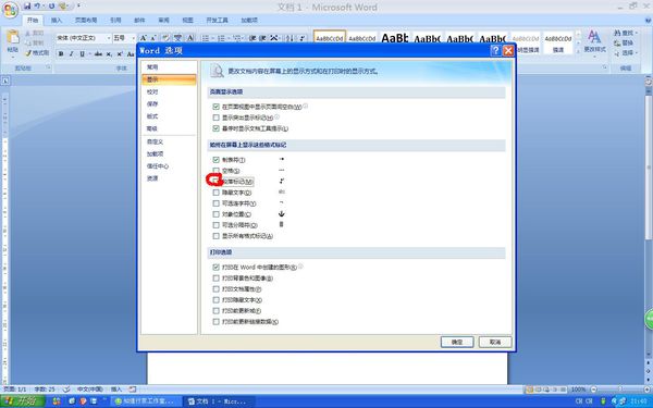 依次点击选择:【工具】→【选项】→然后在“选项对话框”中找到“视图”的内容,再找到“格式标记”,在格式标记的最后面,有个“全部”选项,将“全部”前面的勾(√)勾上