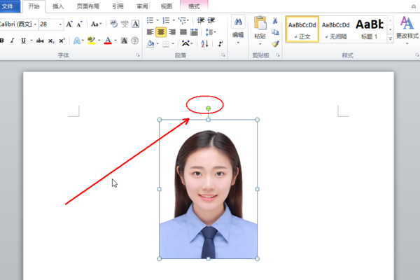1、打开需要操作的WORD文档,点击图片使之处于编辑状态,点击图片上方的小绿点不放,拖动鼠标就可以360度随意旋转图片。