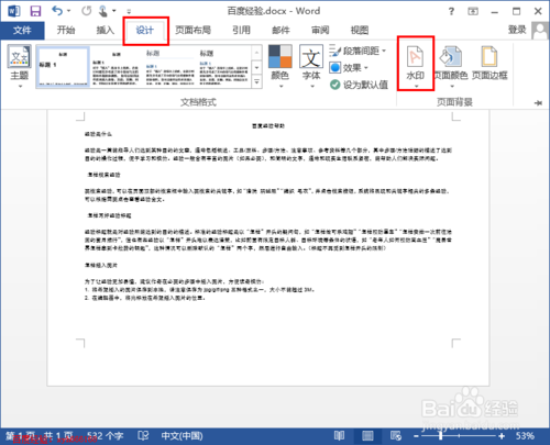 点击菜单栏中的“设计”,打开设计工具栏,如下图所示,选择“水印”工具