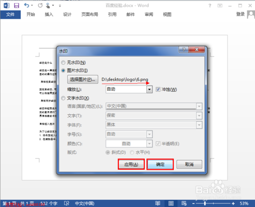 3、设定好水印属性好,点击"应用"或"确定"即可。但这样子添加水印后,文档中只有一个水印,并不能铺满整个文档,我们可以通过下面的步骤让水印铺满整个文档。