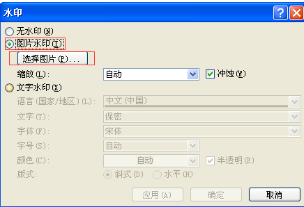 在“水印”对话框中选择“图片水印”,然后找到要作为水印图案的图片。添加后,设置图片的缩放比例、是否冲蚀。冲蚀的作用是让添加的图片在文字后面降低透明度显示,以免影响文字的显示效果。