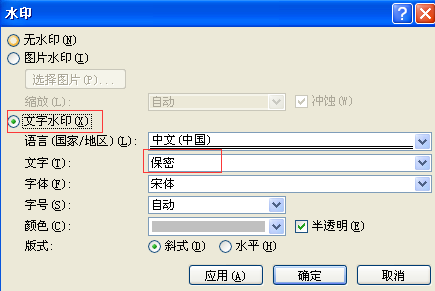 2、弹出水印对话框,选择文字水印,在文字处输入机密,其它的可根据实际要求进入设置,如下图所示;