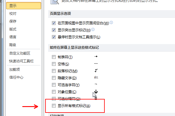 3、WORD2010以上:按“文件”功能区,按“选项”按钮,在WORD选项的“显示”页,“始终在屏幕上显示这些格式标记”项目下,取消“段落标记”的选中状态。