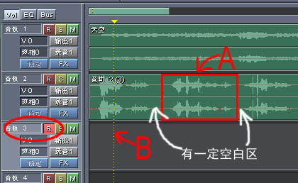 如第二轨人声的A段范围不满意,则在第三轨按下录音准备按钮,在空白点的前一段距离上单击鼠标定下起录位置B,按下正式录音钮开始录音(如图)。