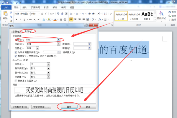 3、在高级标签页字符间距缩放,点击后面的输入框,输入一个小于100%的数值,(可多次修改直到满意)然后点击确定按钮即可。