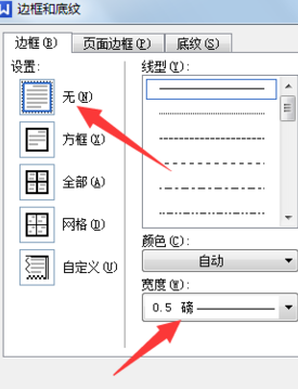 3、在边框的设置选项中选定无,则表格所有线条全部清除线性宽度选择1.5磅。