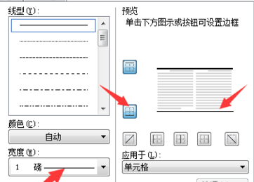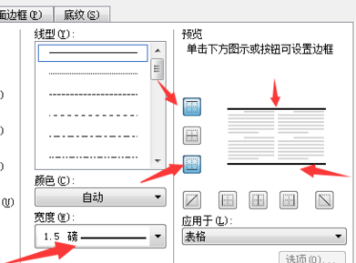 (3)再选中表格,打开菜单“格式-边框和底纹”,在线型宽度下拉列表中选择一条粗一点的线,如1又1/2磅,在右边的各种实框线中,为表格添加“上”、“下”框线。确定。