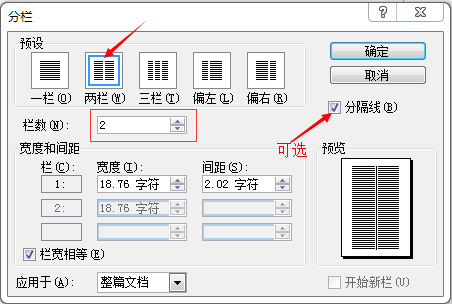 2、在分栏对话框,选择“预设”中的“两栏”(或在下面“栏数”框中选“2”),分隔线可选可不选,这里为了演示的方便选上。