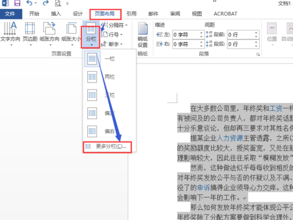 3、然后选中我们想要进行分段的文字,在上方菜单栏中找到页面布局下的分栏,并选择更多分栏选项。