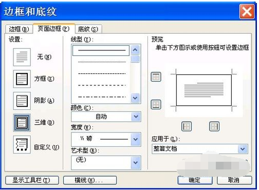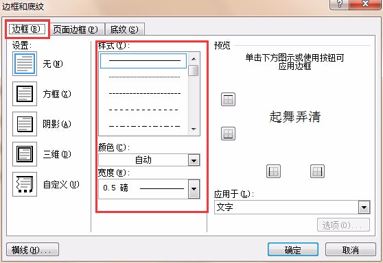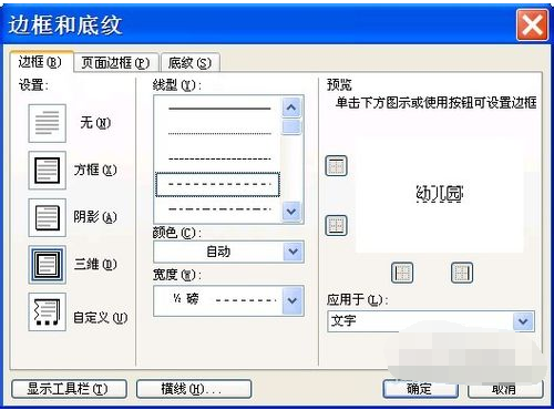 2、打开边框和底纹对话框,选择“边框”选项卡,可以在设置栏选择要设置的边框类型,如无边框,方框,阴影,三维,自定义等。在线条栏可以对边框的线条进行相应的设置,选择需要的线条;