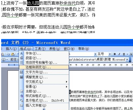 1、选择要进行设置内边框和外边框的文字,如图中要对这段文字中的第一个“幼儿园”设置边框,选定文字后,点击“格式”菜单,执行菜单中的“边框和底纹”命令。如下图所示;