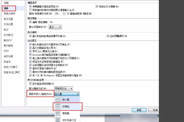 2. 在”选项“窗口中,在”编辑”选项卡下,将插入图片的格式选择为“四周型”。